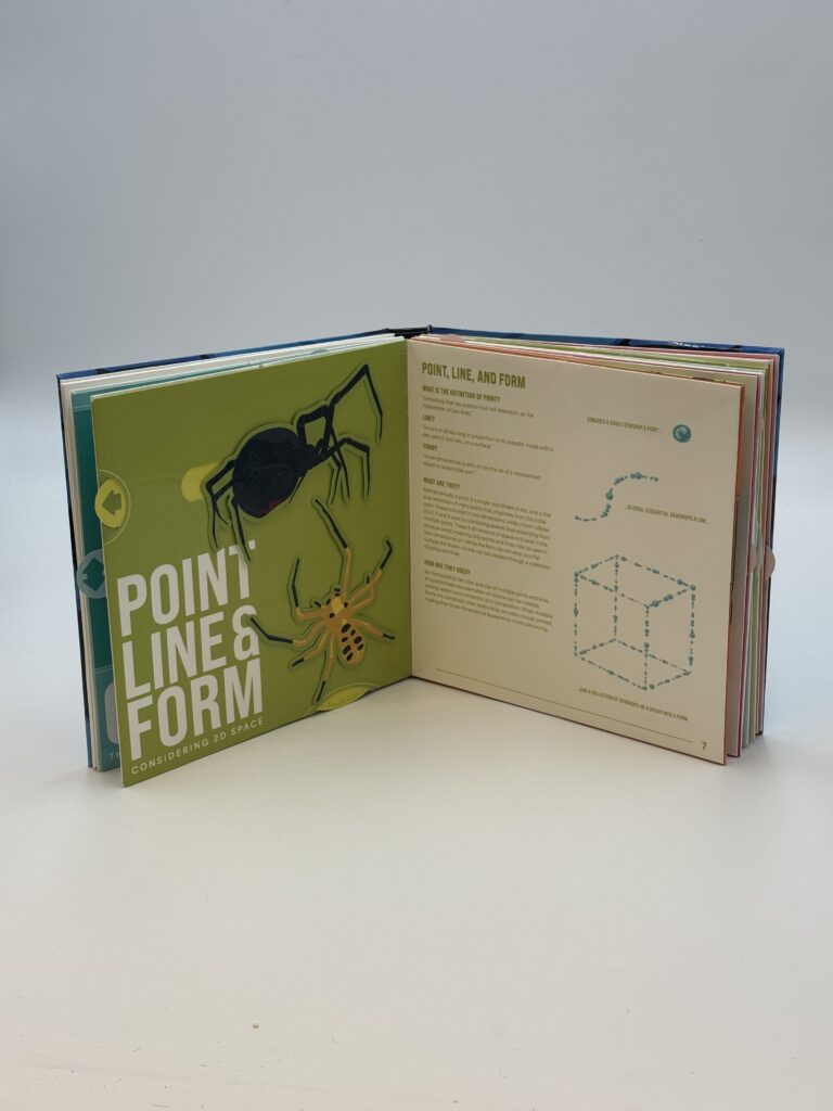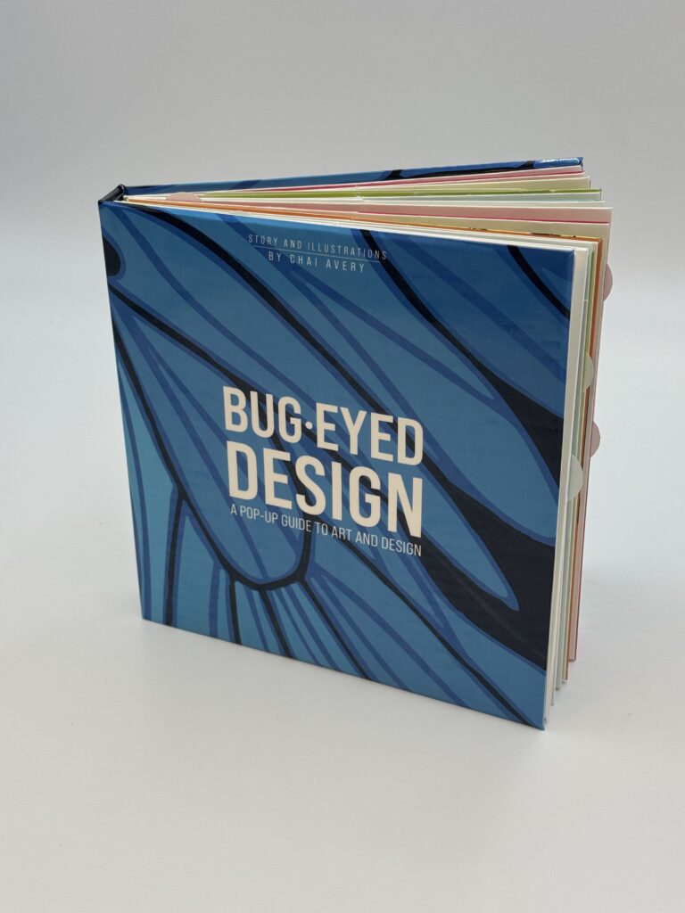 Bug-Eyed Design is an interactive pop-up book that teaches the elements and principles of art through insect imagery and paper mechanics. The project grows from my lifelong fascination with pop-up books and three-dimensional paper craft, combined with my education in art and design. This book functions as an educational guide to the fundamentals of visual design, with particular emphasis on the concepts most useful to graphic designers. Each concept is illustrated by comparison to an insect, coupled with a moving mechanical component that demonstrates the concept in action. Each page is constructed from vinyl-reinforced cardstock, meticulously cut and mathematically composed to move and be physically interacted with. Pull tabs, layered structures, and pop-up mechanisms allowed the reader to manipulate the page and experience the design concept through motion. The movement of the paper components reinforces the idea being explained, transforming abstract principles of art into a tactile experience. Although much of my work as a graphic designer is primarily digital, this project is intentionally physical. Historically, books have been the primary way humanity has recorded and shared information, with the earliest examples over a century old. While the internet and smartphones have shifted much of this information into digital space, physical books still offer a form of interaction that screens cannot replicate. Through paper engineering and mechanical design, this project explores the continued potential of the book as an interactive object. For me, working with analog materials has become an increasingly valuable source of inspiration. In contrast to the constant presence of screens, digital media, and artificial intelligence, the physical process of cutting, assembling, and constructing the book reconnects design with material and movement. Bug-Eyed Design embraces the tactile possibilities of paper to transform design education into an engaging, hands-on experience.